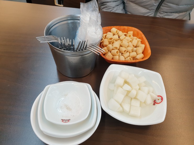 자리를 안내받으니 치킨무, 과자등을 주셨습니다.