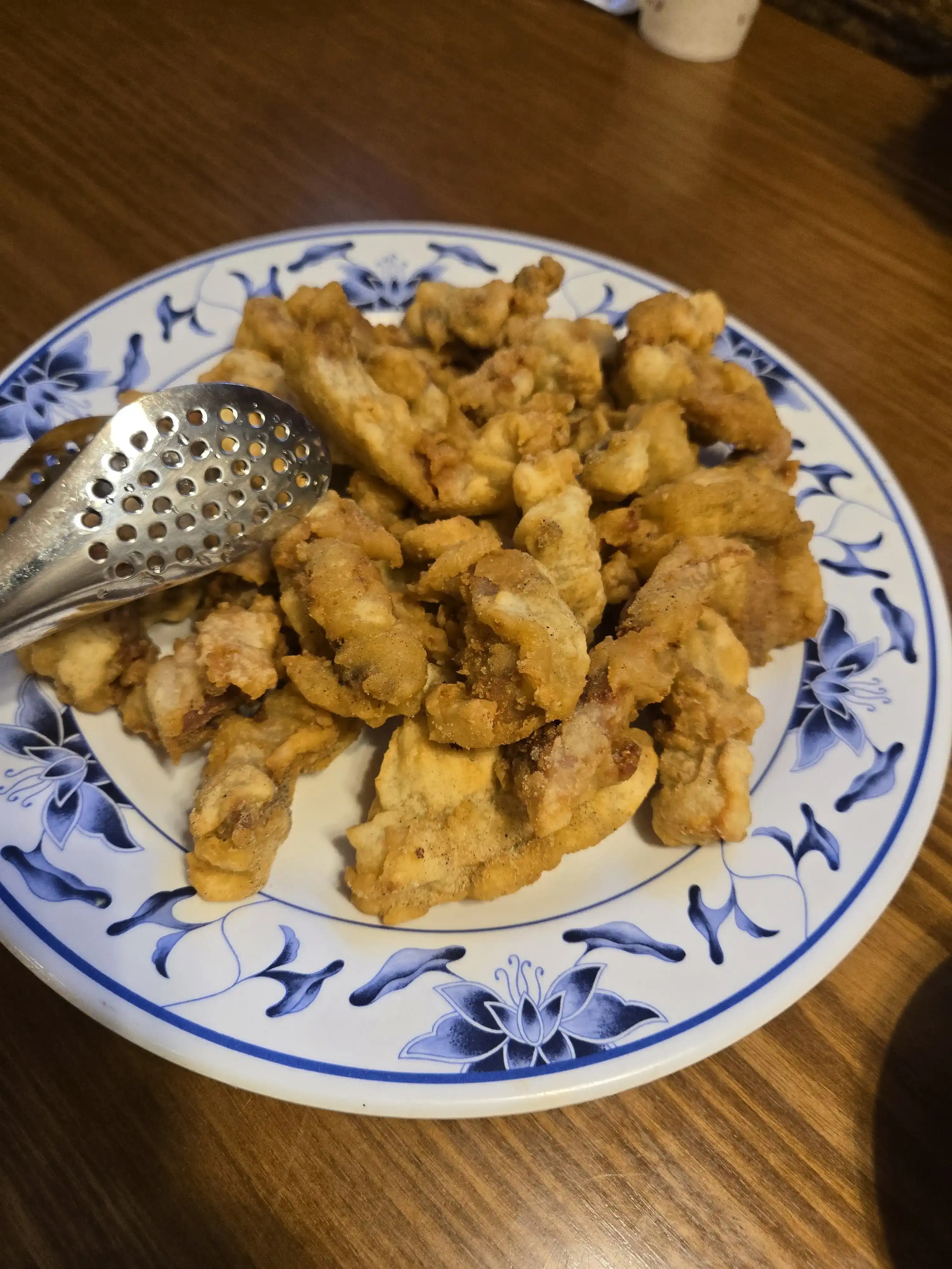 고기튀김은 탕수육이랑 비슷한데 소스에 찍어먹는게 아니라 튀긴고기 그대로를 먹는다.