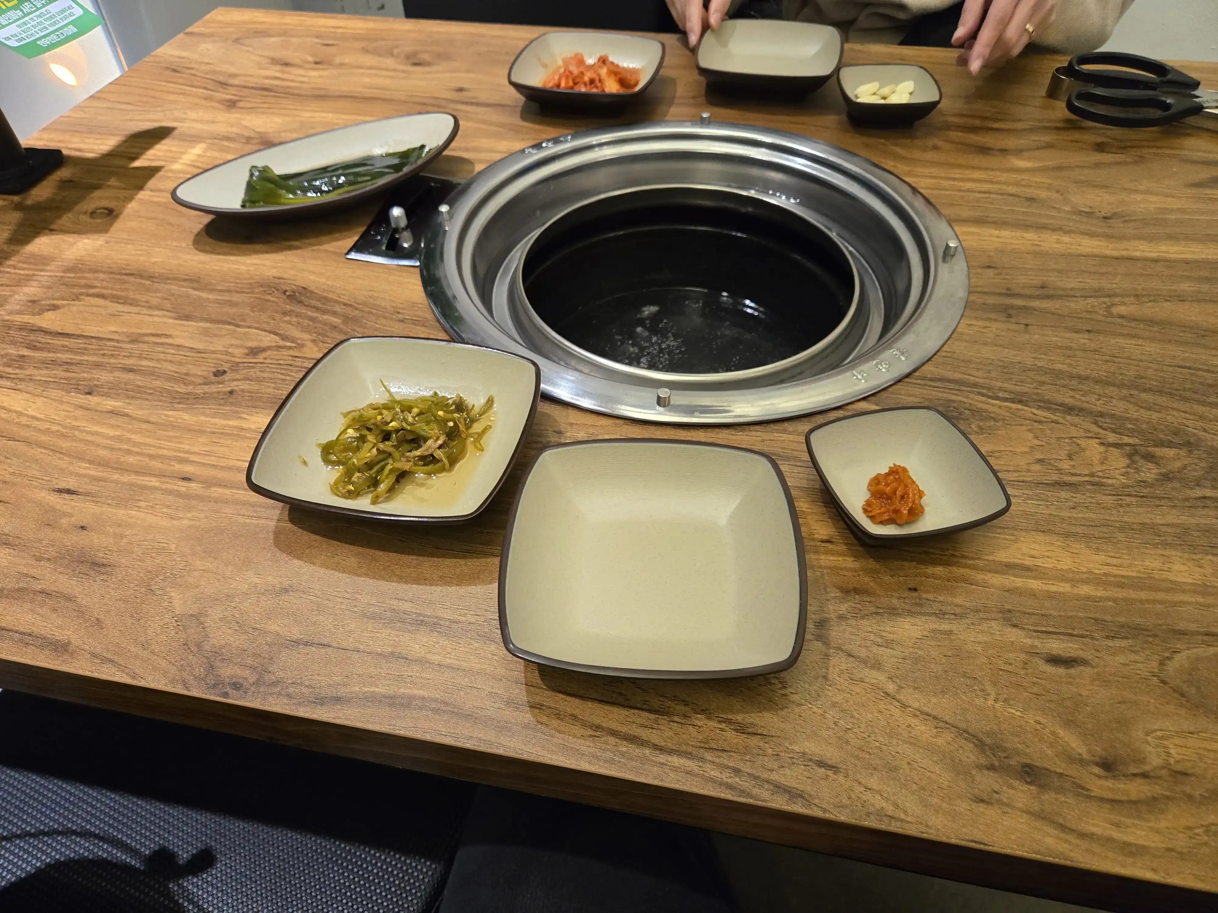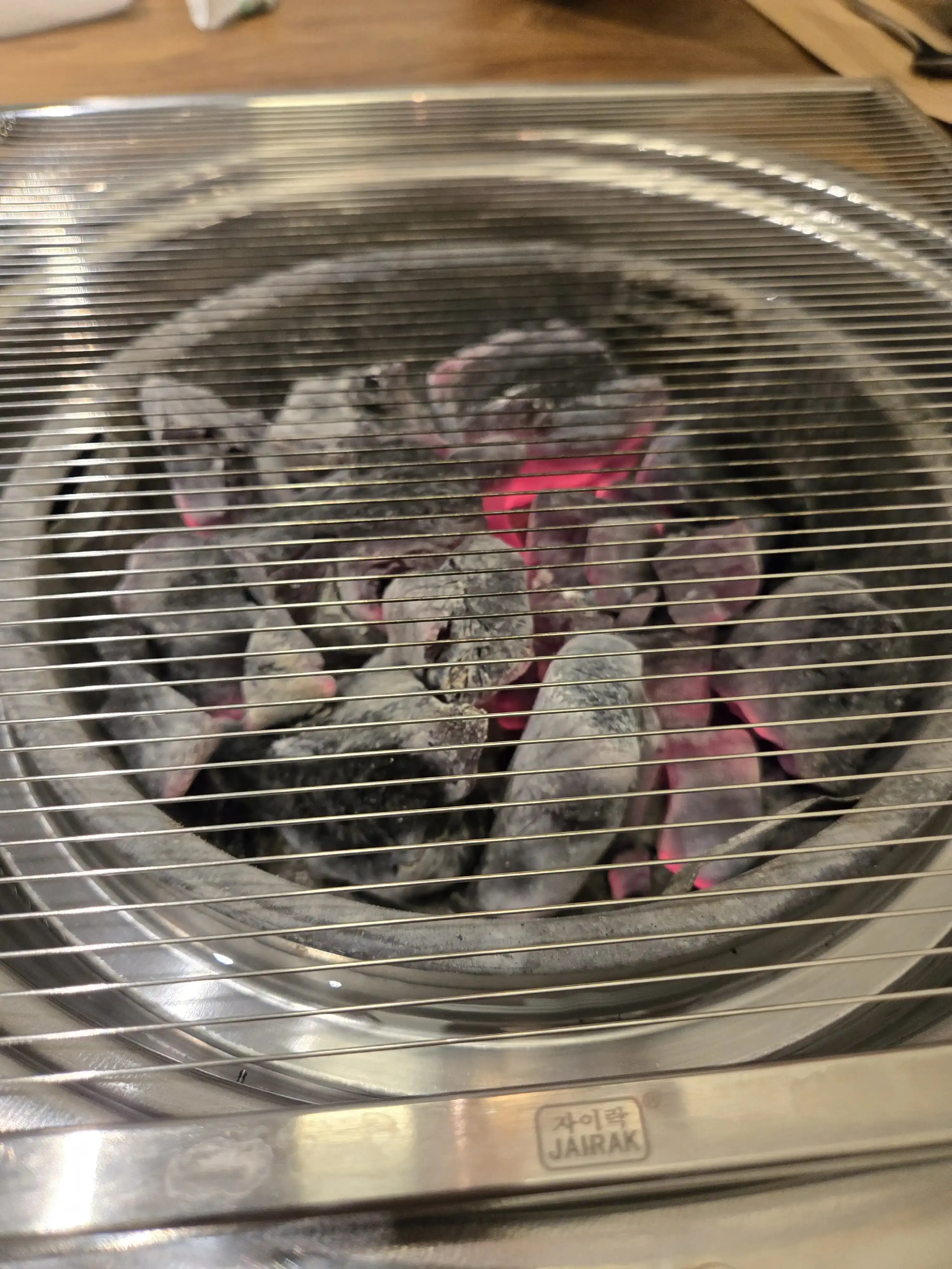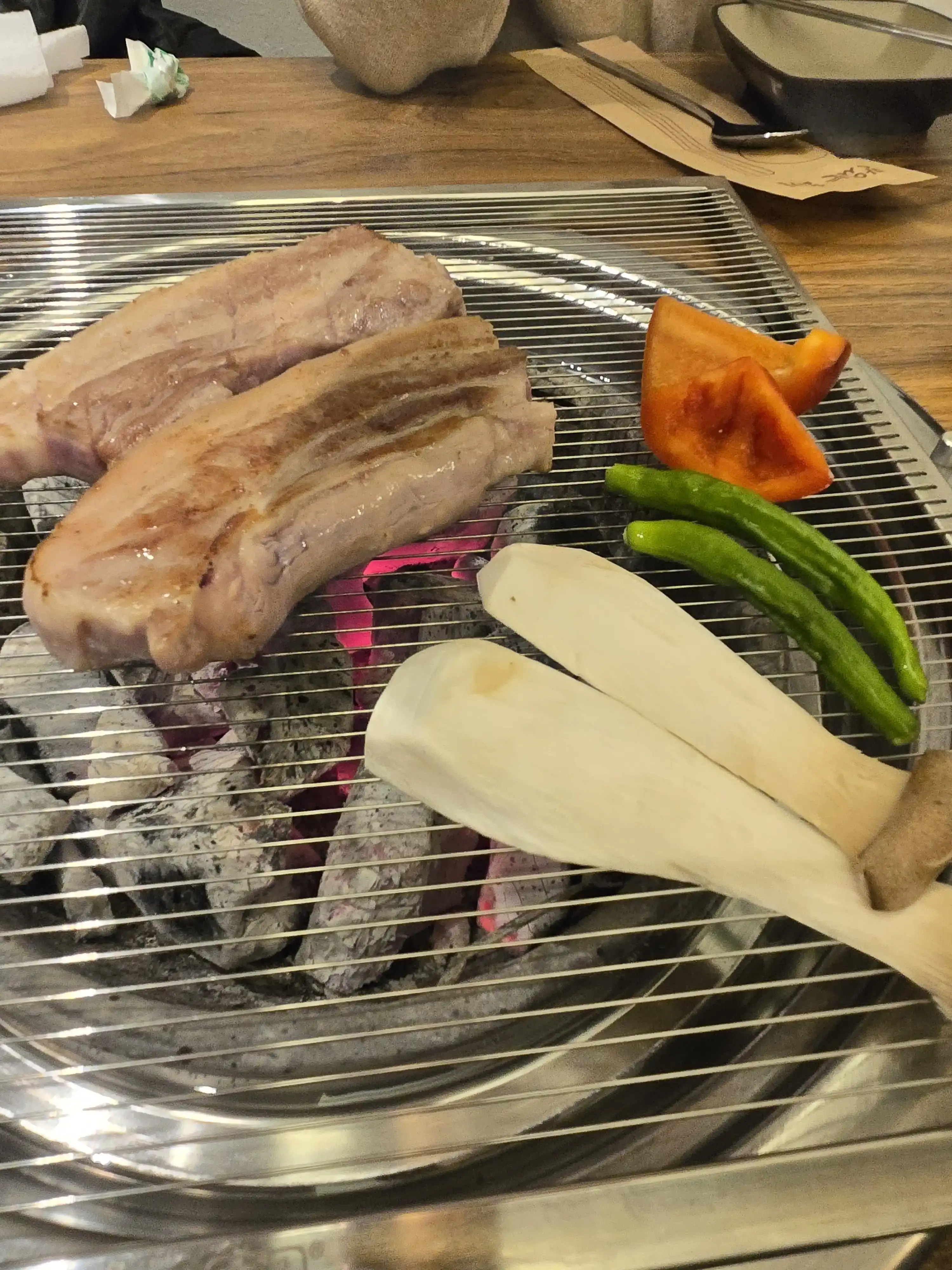 개인적으로 무쇠불판을 좋아하지만 고기마을에서는 숯불이다.