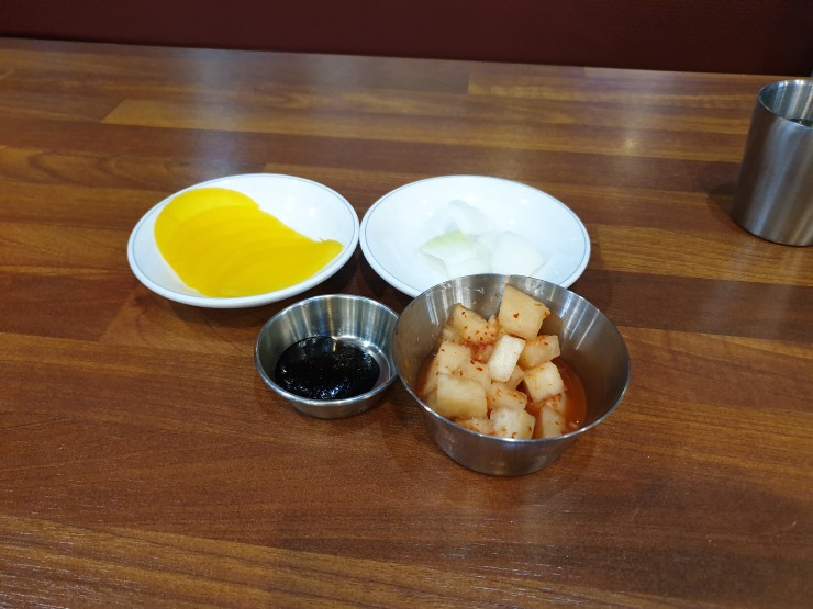 자리에 앉으니 가져다주신 단무지, 양파 그리고 깍두기 입니다ㅎ